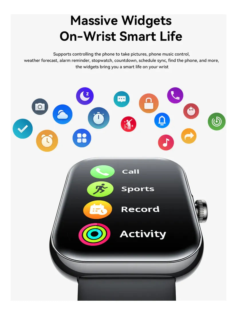 Con una pantalla de 1.96 pulgadas, este smartwatch ofrece una visualización clara y nítida de notificaciones y datos de salud. Equipado con 100 modos deportivos, permite realizar un seguimiento riguroso de diversas actividades, apoyando a los usuarios en alcanzar sus objetivos fitness. Además, cuenta con funciones como monitor de ritmo cardíaco, medición de oxígeno en sangre y un registro del sueño, brindando información valiosa para una vida más saludable.